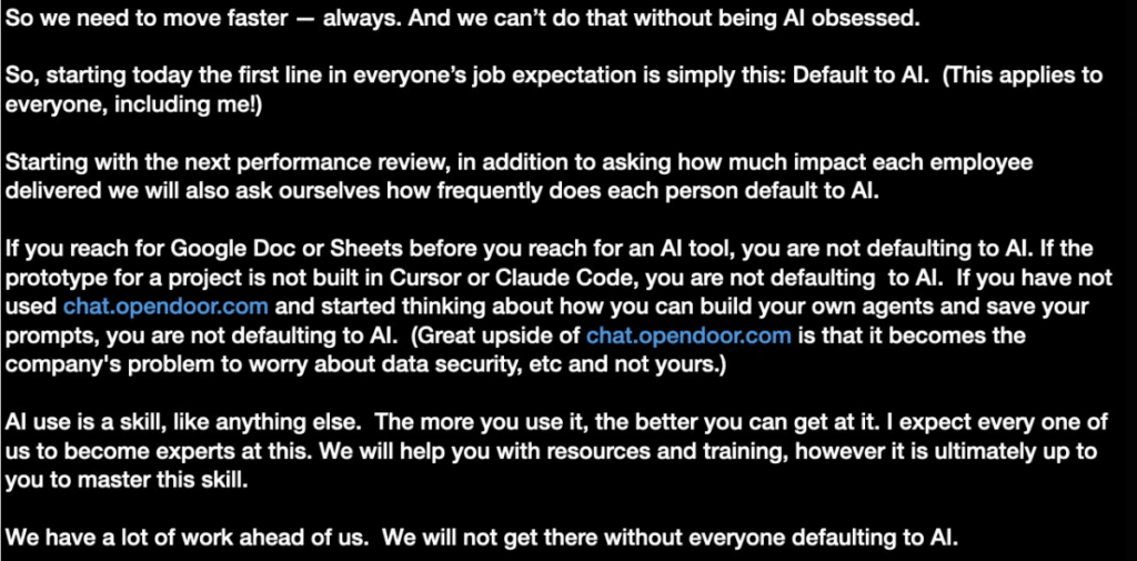 The most recent comes from the new CEO of Opendoor, mandating that everyone at the company begins “defaulting to AI”: